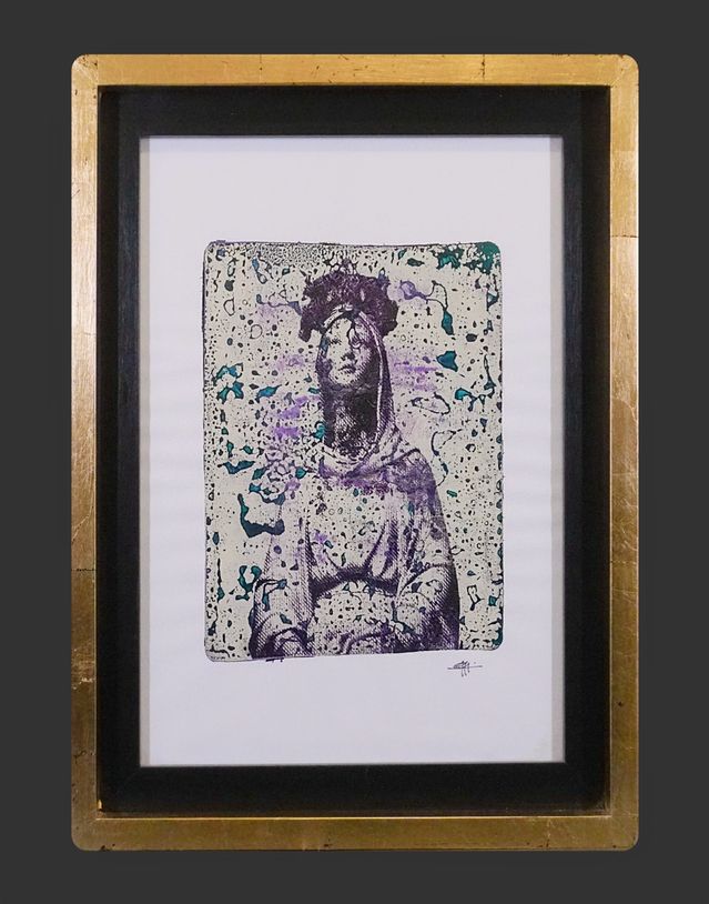Marco: Caja veneciana. Madera con hoja de oro. Cristal antirreflejante.